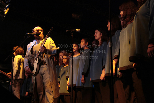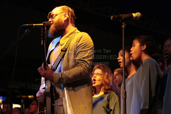 During the set, the band was accompanied by the Brooklyn Youth Chorus and members of the Brooklyn Philharmonic Orchestra, both of which had performed earlier that night.