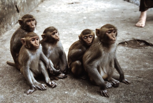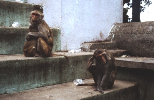 Monkeys that roam freely around in Popa Hill (Mount Popa), Myanmar in 2002.
