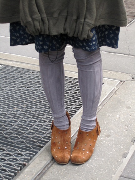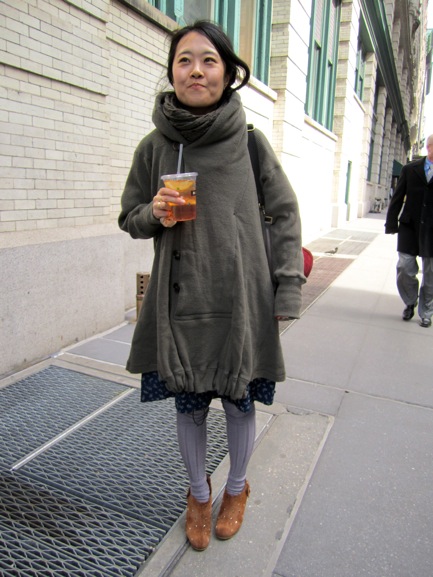Dig the way her stockings are scrunched and how the hem of the coat is cinched. I love this whole look.