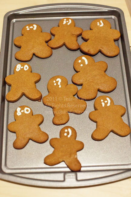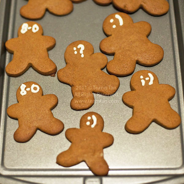 I loves me a carb-fueled day by a hot 350 degree oven. Bowls and ingredients spread out on a wide table (or kitchen island..sigh…) ready for creating something unknown and hopefully tasty. Like a mad scientist I love experimenting with different ingredients, like adding apples to brownie tarts, and this time adding some instant coffee to some gingerbread men cookie dough. After the baking comes the fun of icing the cookies. Instead of the traditional smiley face design, I utilized the ever ubiquitous emoticons of happy, questioning, winking, shocked, and a few others symbols. Call it the 21st century gingerbread man if you’d like. I call them delish.