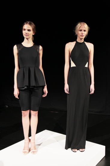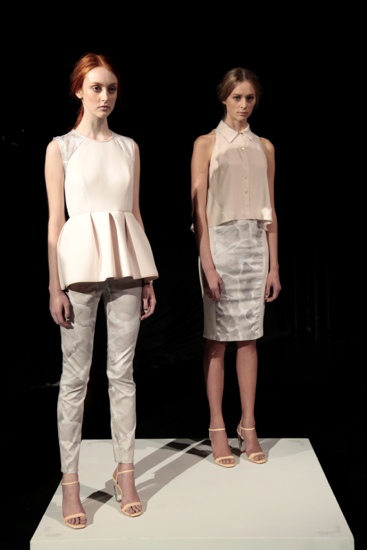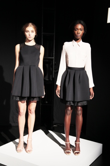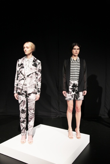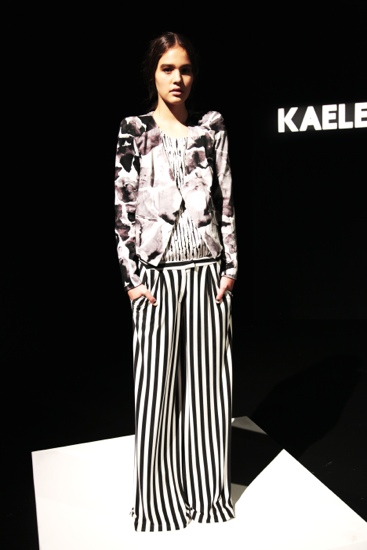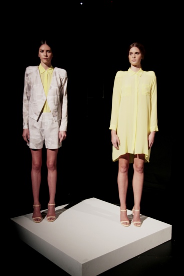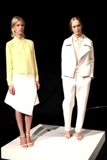 Kaelen Haworth presented her Spring 2013 collection at the Box this morning at Lincoln Center in New York City. The models presented in pairs on platforms donned femininine yet structured jackets to patterned pants and dresses. When color was used, the color of the season, yellow, was it. A very pale shade of pink was also present. Fullness of form was achieved with pleats giving a childlike feel to some of the dresses.