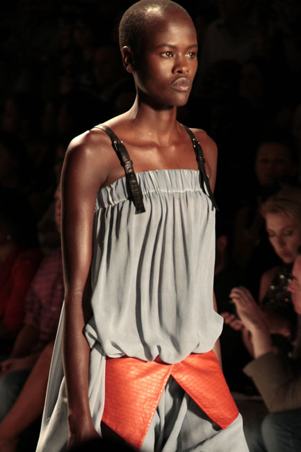 Korean designer Choonmoo Park showcased her Spring 2013 collection PARKCHOONMOO at the Studio last night at Mercedes-Benz Fashion Week in New York City. Her industrial design background is evident in her men’s and women’s line.