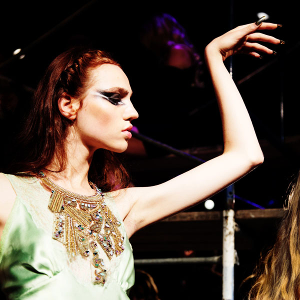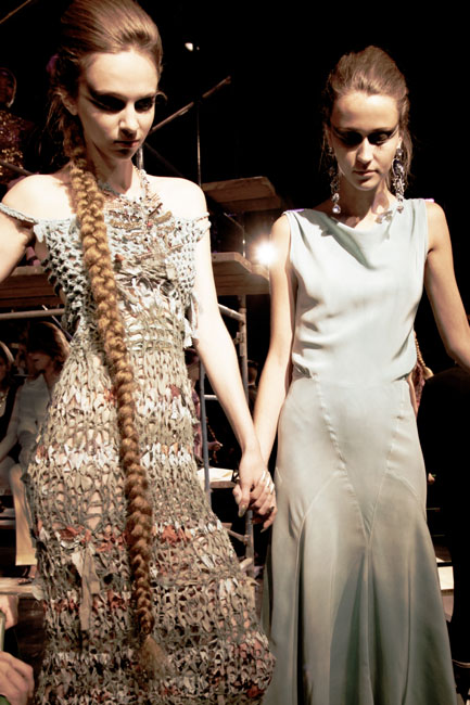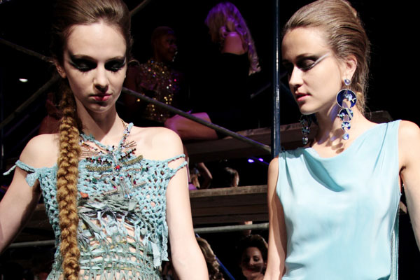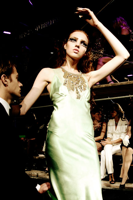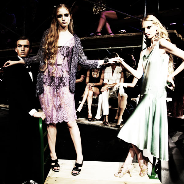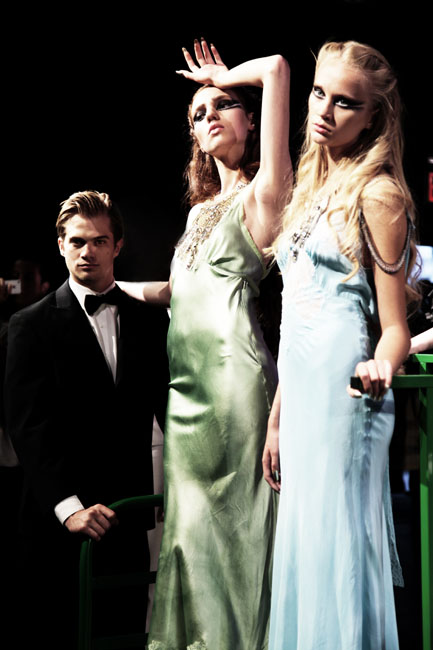 The Erickson Beamon presentation during Mercedes-Benz Fashion Week in Lincoln Center was definitely one of the more interesting presentations at the Box. Female models stood on trolleys as they were pushed along by male models. A scaffold was placed in the center of the room where socialites, celebs, and models sat and mingled amongst themselves.