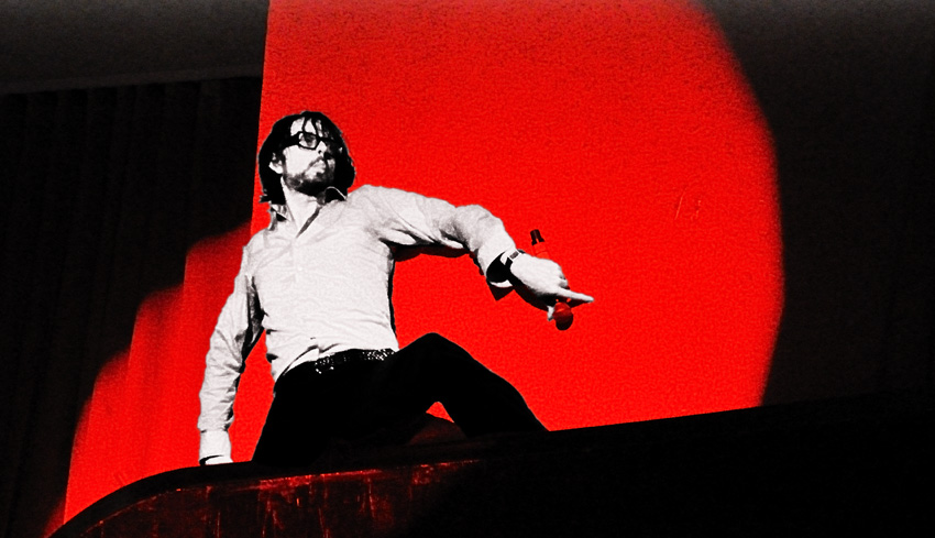 John Maus performing at the RiverRocks free concerts at Pier 84 in New York City. This image summed up his performance-intense and tortured.