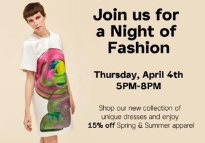 If you love bright colors, swirling patterns, and Finnish design, head on over tonight to Marimekko for their fashion event including 15% off their Spring/Summer apparel.