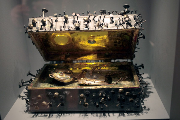 Cask: wood box covered with lead, snakeskin, and found objects, with plexiglass insert.