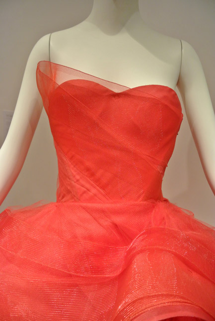April 26 2013: Vera Wang cardinal red gown, Spring 2013: strapless wedding dress inspired ball gown with multi-layer organza and tulle with horsehair trim detail.
