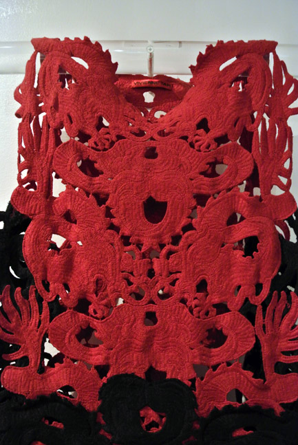 April 26 2013: Vivienne Tam red and black felt wool open work cut out dress, Fall 2012.