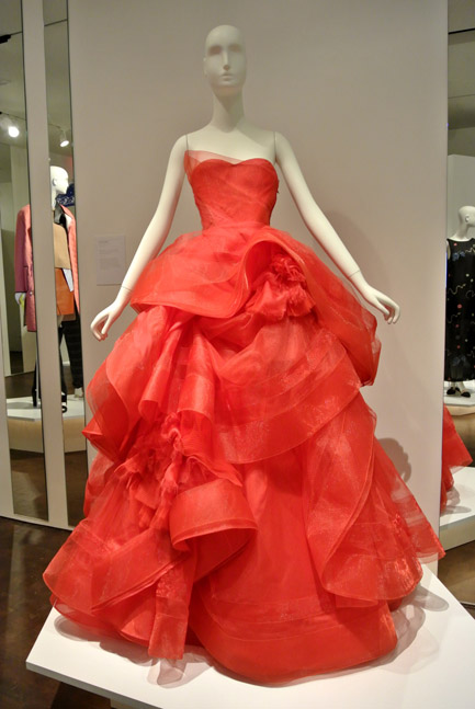 April 26 2013: Vera Wang cardinal red gown, Spring 2013: strapless wedding dress inspired ball gown with multi-layer organza and tulle with horsehair trim detail.
