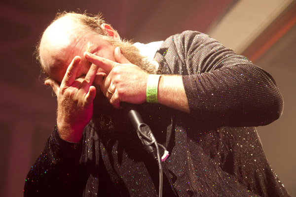 Tim Harrington of Les Savy Fav started out the performance in a silver smock, then took that off to uncover a black cape, then white overalls, and finally ending up in some cut-off white denim shorts. It was like peeling layers of onions, each reveal being spicy and intense.