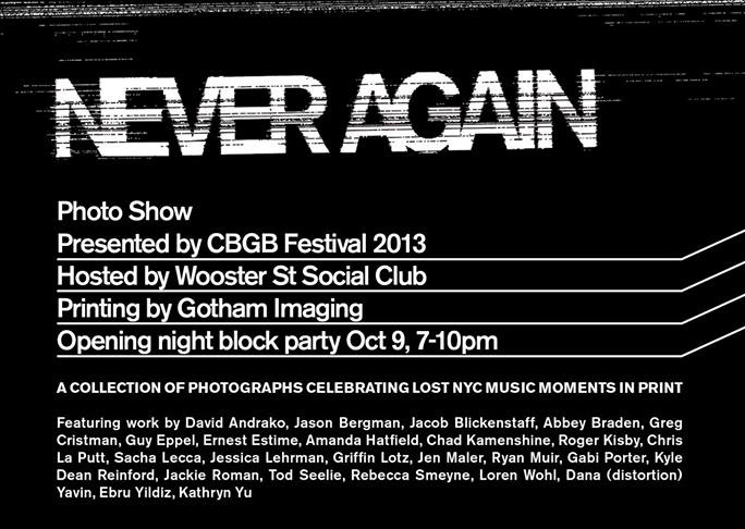 Located at 43 Wooster Street in New York City and presented by CBGB Fest 2013 and Wooster Street Social Club, this group show will present some works by some of my favorite concert photographers, a few of whom I’ve had the privilege to shoot next too.