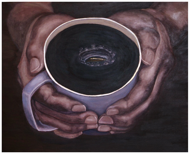 I had to make some statement though, so I decided to keep painting and the title came immediately…‘A Cozy Morning in Aleppo’. It’s meant to be ironic when you’re in a major city of a war stricken country. There’s no coziness for it’s citizens-young, old, weak, or strong, but perhaps for one brief moment in a tiny corner of dark solitude one can feel a false sense of ease, but only for a moment. I wanted to capture that moment. The hands holding a cup of morning joe create a deformed heart shape. The bullet in the center drops into the cup held by the heart-shaped hands. The bullet is meant to be the irony in this short tranquil scene. It’s just plain wrong, but it is what it is.