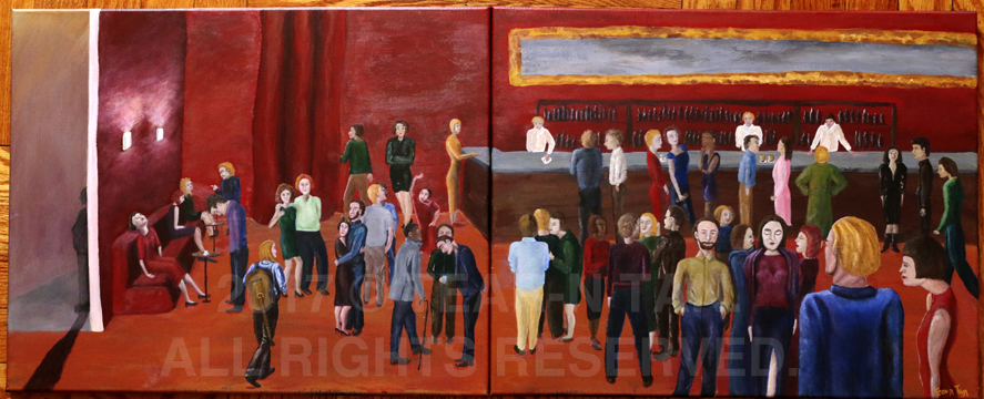 I’ve broken down each side so you can see them close up, just below the full diptych. I love doing pieces with people scattered about and this one starts with the viewer (you) at the far right behind the man in blue whose back is facing you.