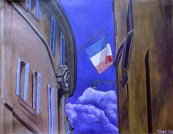 The first painting is 11×14 of a French flag hanging from a building in Arles, France. The original photo was shot in 2016. I finally got around to painting the scene. I chose purple as the dominant hue for the sky and clouds because blue and red (from the flag) equal purple. I hope that makes sense.