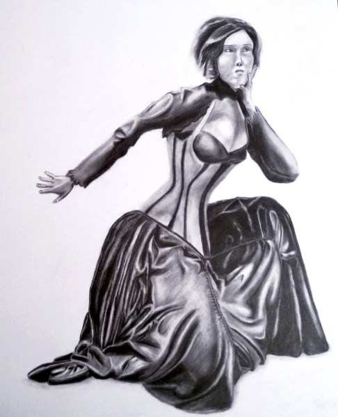 My latest piece completed this weekend is a woman crouching in Steampunk fashion. The photo reference was from an October 2010 event I shot.