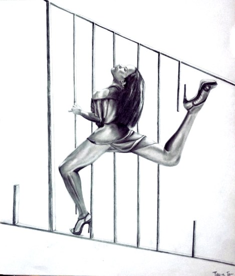 Latest piece of model climbing a fence. I wanted this drawing to symbolize freedom. She just happens to be stunning while breaking out.