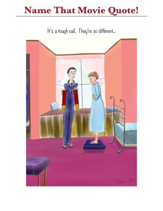 I’ve re-purposed old movie quotes to fit these illustrations. Can you guess the trivia? Answers are below each piece. Just drag your mouse across from where arrow begins.