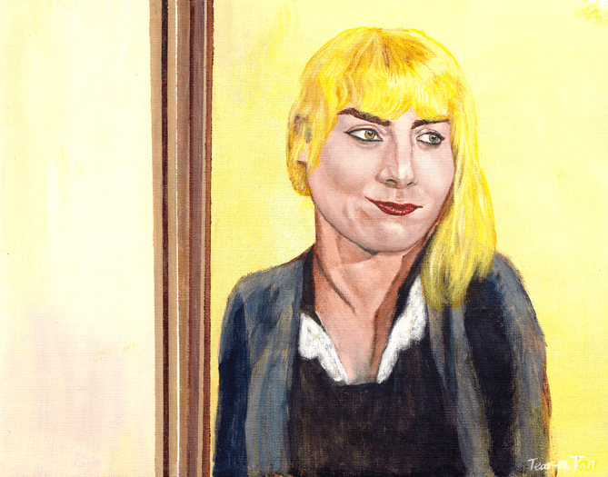 The original photo was taken in 2009 at their hotel in New York. Coincidentally her hair was almost the same color of the wall. The painting is of Martial’s reflection in the mirror as her partner Orion Bouvier was to the left of the photo. Sorry to cut you out of the painting Orion. =)