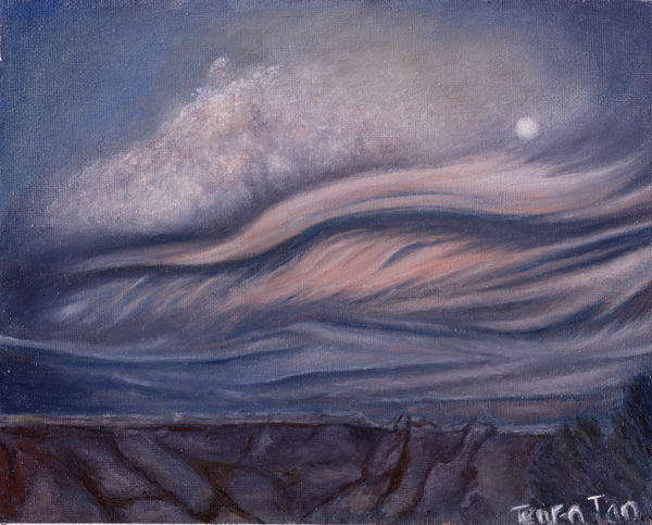 I wanted to capture the clouds which were so varied in shape, texture and hue. I loved creating the thin, pink, wispy, cirrus clouds. I think I’ll use titanium white next time instead of zinc white. I was glazing, and thought it would work better, but the white just didn’t seem to pop here.